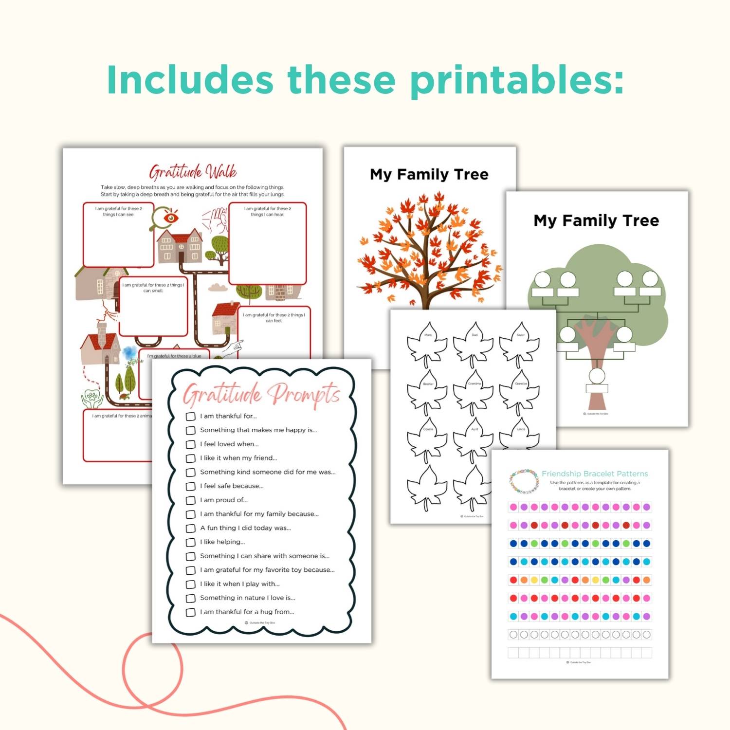 - Printable extras like friendship bracelet patterns, a family tree, gratitude prompts, and a gratitude walk