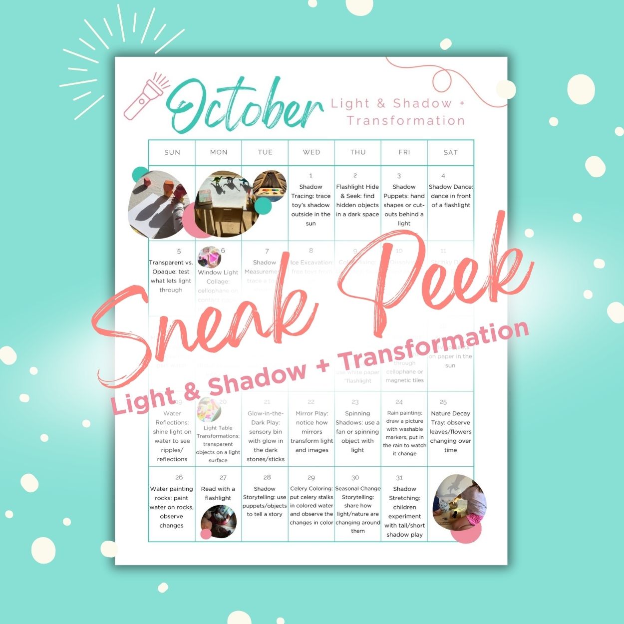 ✨ Want even more? Pair these Play Plans with the Light, Shadow, & Transformation Play & Learn Pack! It includes 52 printable pages, like a Transformation Journal, tracing sheets for your light table, shadow puppets, and matching/sorting games, that make the October theme even easier (and more fun!) to bring to life.