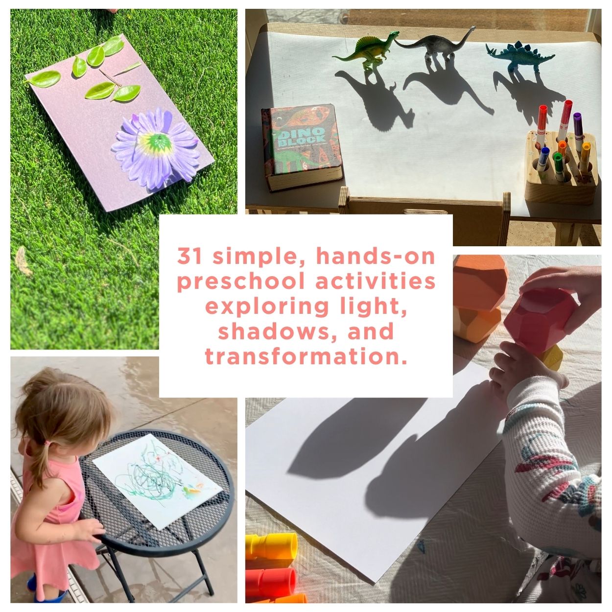 A month of hands-on preschool activities exploring light, shadows, and transformation. Includes activity calendar, book list, materials list, and DIY light table tutorial.